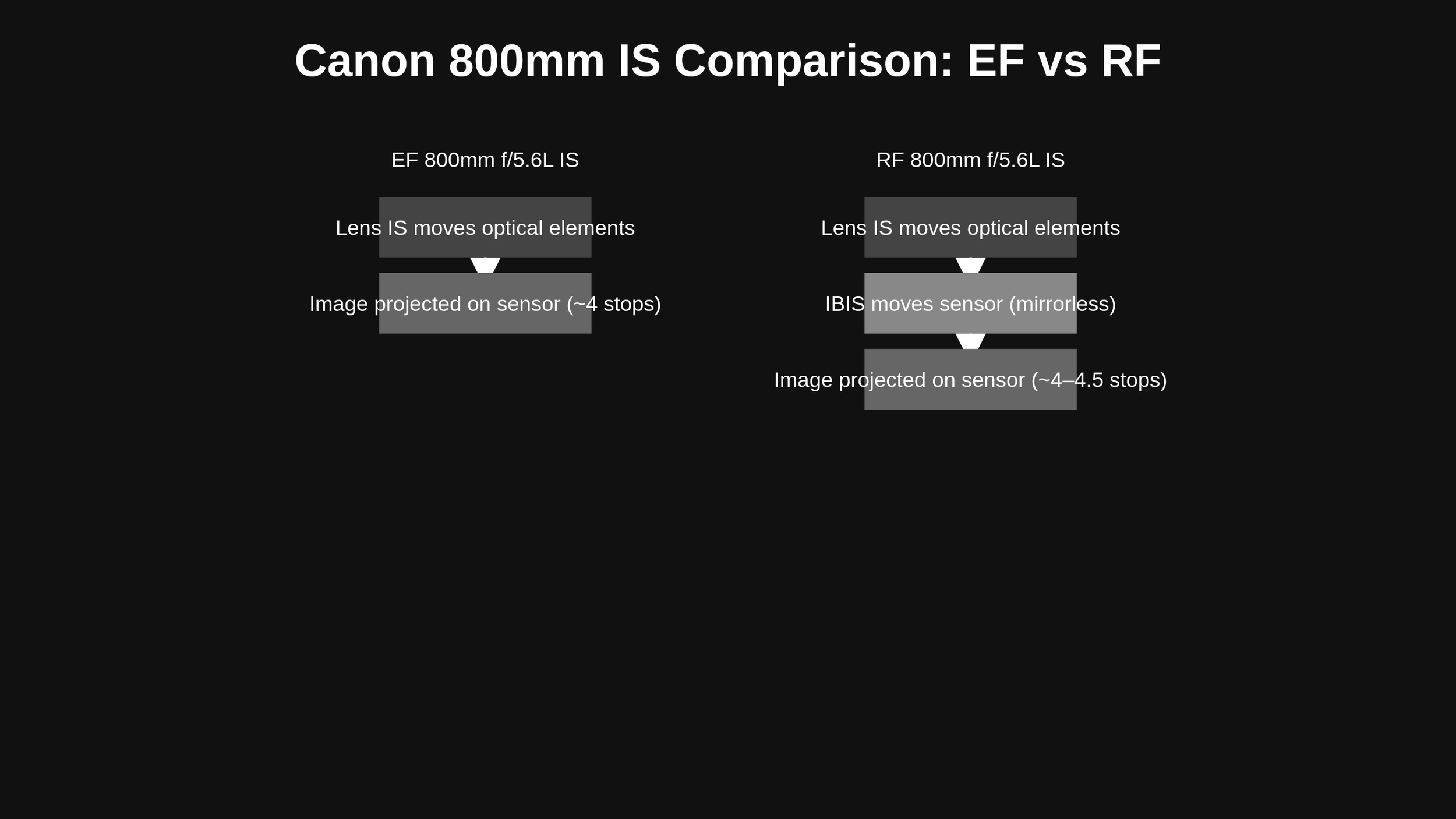 The RF 800mm features 4.5 stops of IS, slightly better than the EF’s ~4 stops. More importantly, the RF introduces three IS modes:
