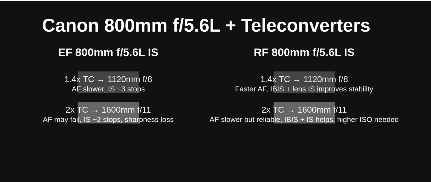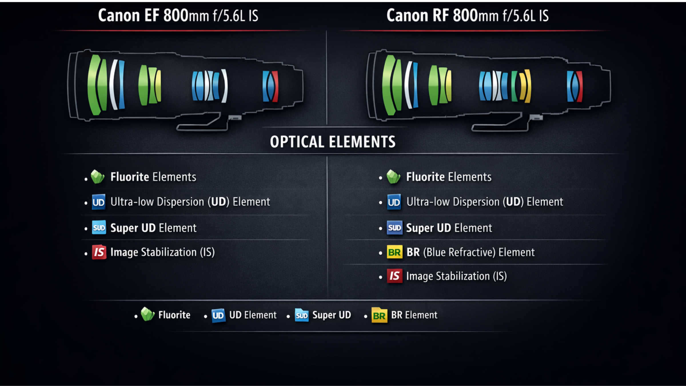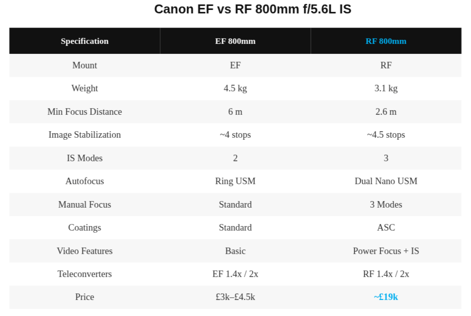 This table provides a clear, side-by-side comparison of the key specifications and features of the Canon EF 800mm f/5.6L IS and the newer RF 800mm f/5.6L IS lens.